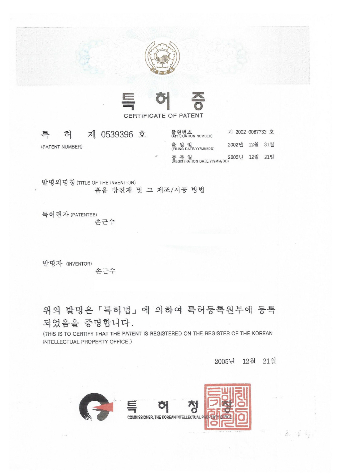 Patent Certificate 10-1196641